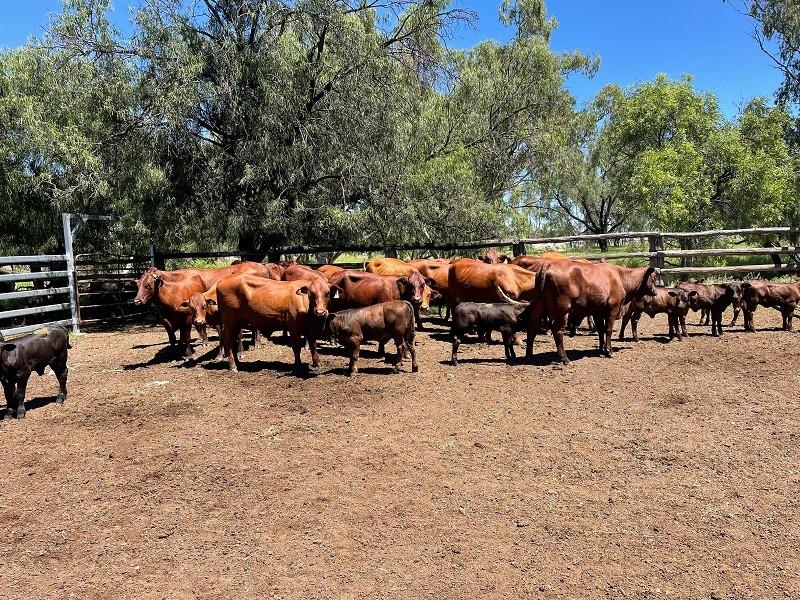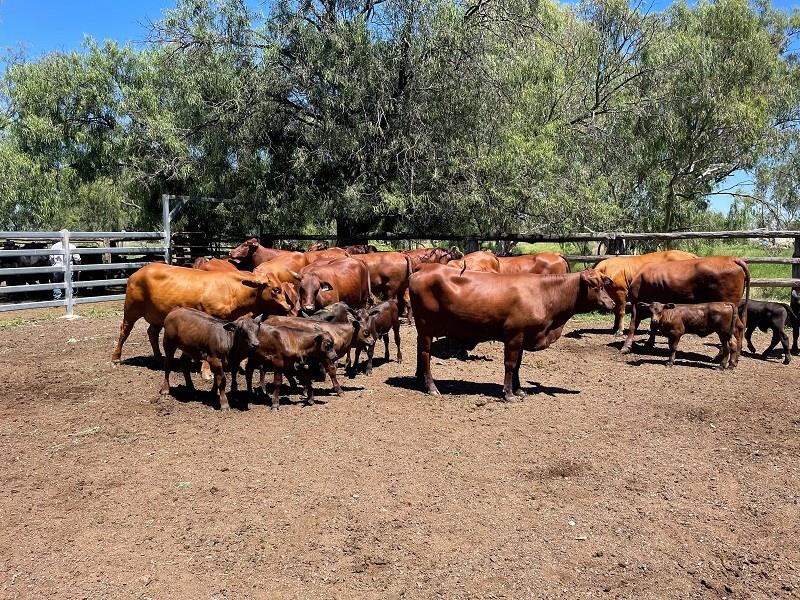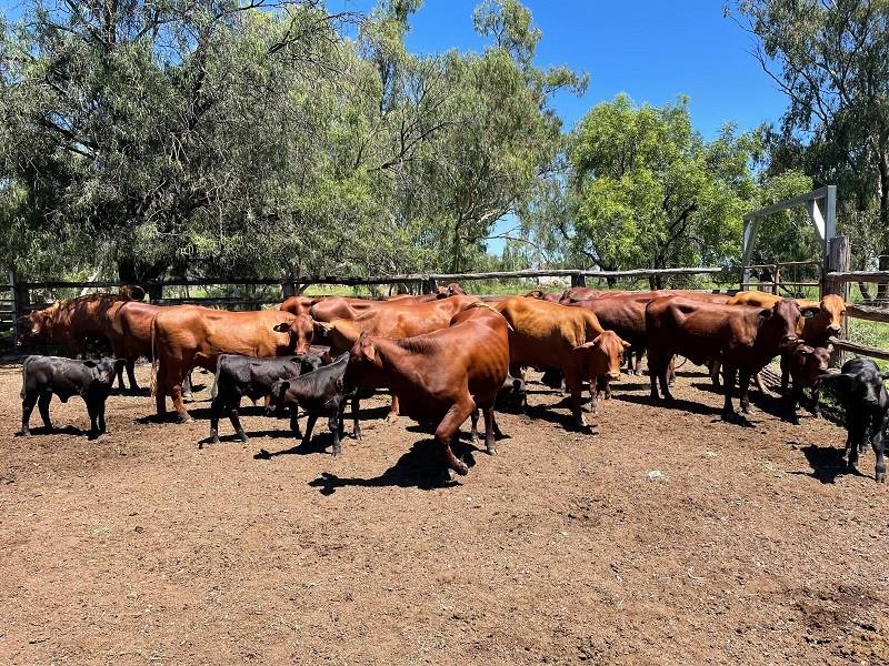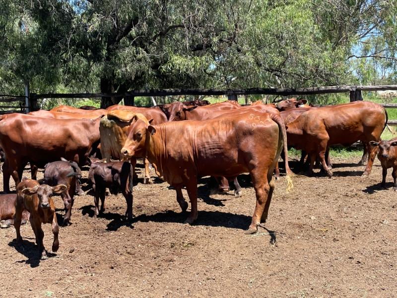 GOOD QUALITY SANTA & DROUGHTMASTER X HEIFERS WITH ANGUS X CALVES AT FOOT , MEDIUM FRAMED HEIFERS PRESENTING GOOD HEALTHY CONDITION .HEIFERS ARE MILKING WELL & DOING GOOD JOB ON THEIR CALVES. IF GIVEN THE CHANCE THESE WELL BRED HEIFERS WILL GROW INTO GOOD MEDIUM TO LARGE FRAME PRODUCTIVE BREEDERS.