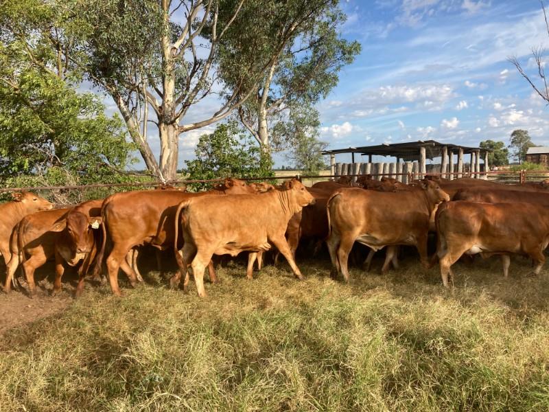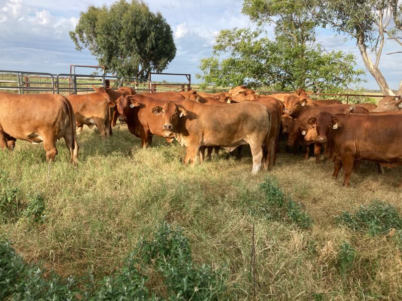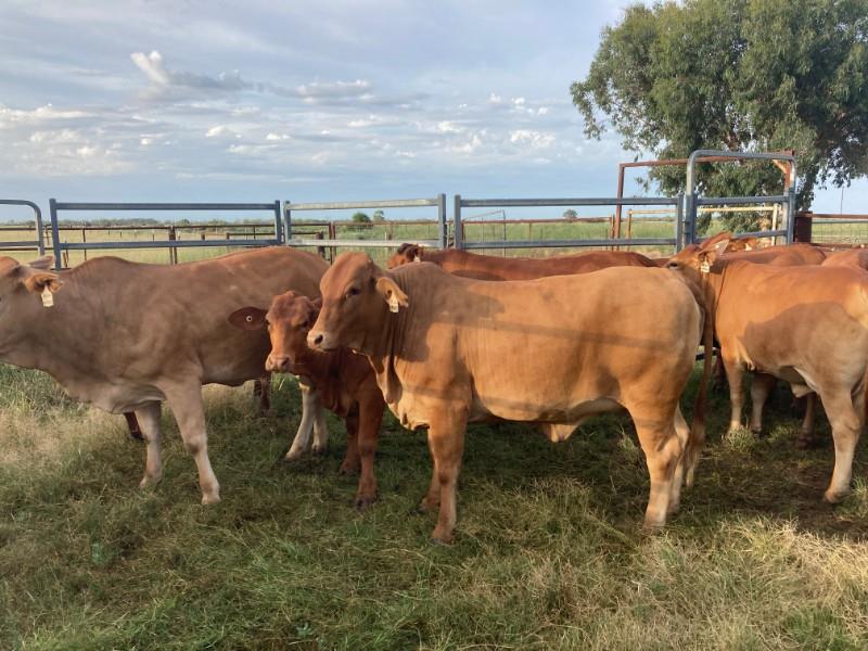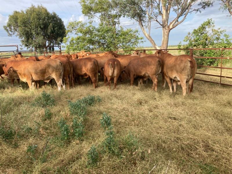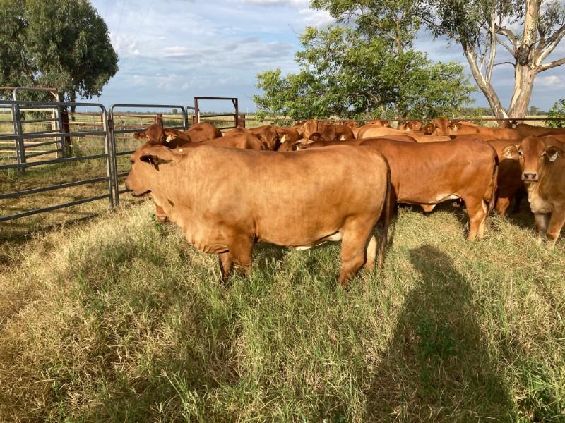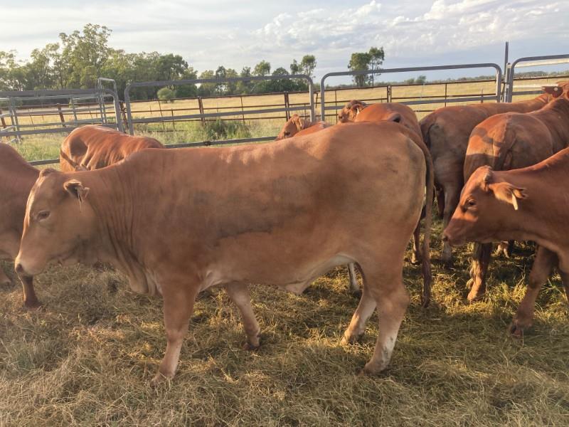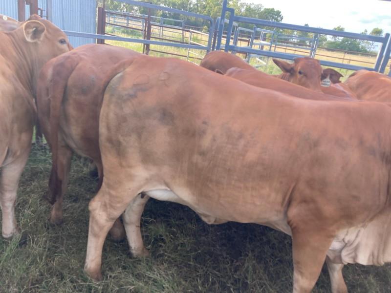 TOP QUALITY LINE OF ONE BRAND DROUGHTMASTER HEIFERS IN PRIME CONDITION # 0 YEAR BRAND PTIC TO ANGUS BULLS . BULLS PUT IN FROM 15/6 TO 13/8. PURCHASED EX EMERALD AS WEANERS. NOTE 34 HEIFERS ARE PTIC PLUS 2 HEIFERS WITH DROUGHTMASTER CALVES AT FOOT. 1 HEIFER CALF AT 210 KGS 1 MALE CALF AT 135 KGS WHICH WHERE IN CALF PRIOR TO PURCHASING. THE PURCHASER HAS THE OPTION TO TAKE THE 2 HEIFERS AND CALVES OR LEAVE OUT. 2 HEIFERS WITH BLACK NOSE .