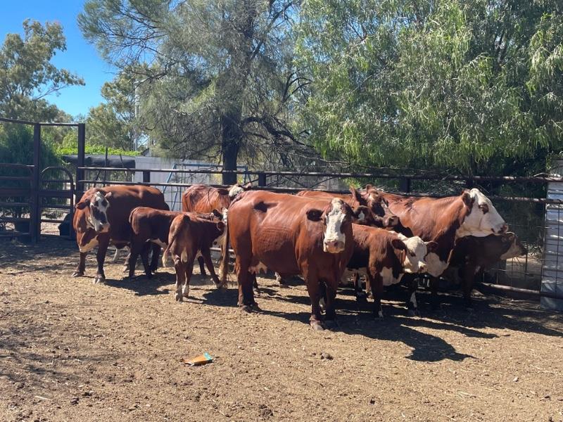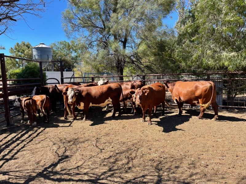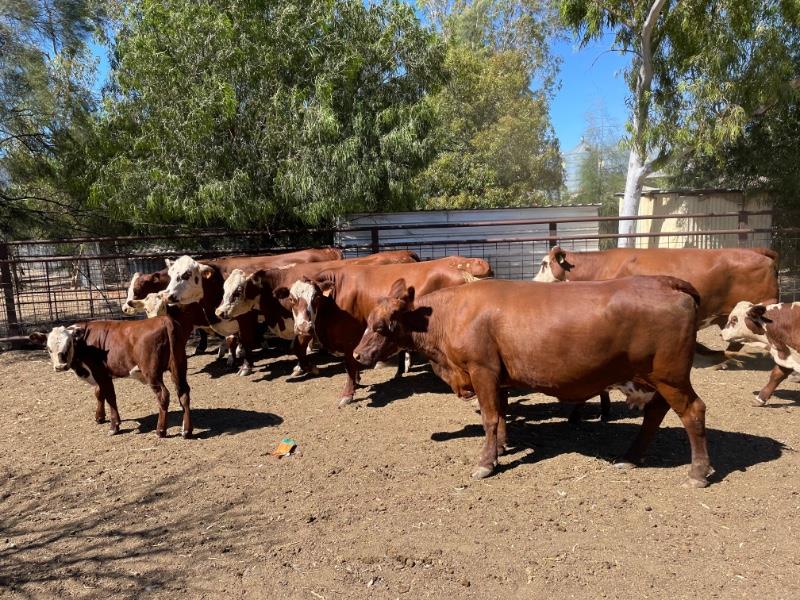 GOOD QUALITY LINE OF LARGE FRAME SANTA/HEREFORD X COWS WITH CALVES APP 200KGS AT FOOT. COWS RANGE FROM 4 TO 14 YEARS , OLDER COWS RANGE FROM LOOSE IN TEETH TO BROKEN/GUMMY.COWS DOING A GOOD JOB ON THEIR CALVES & RUNNNG BACK TO THE BULL.